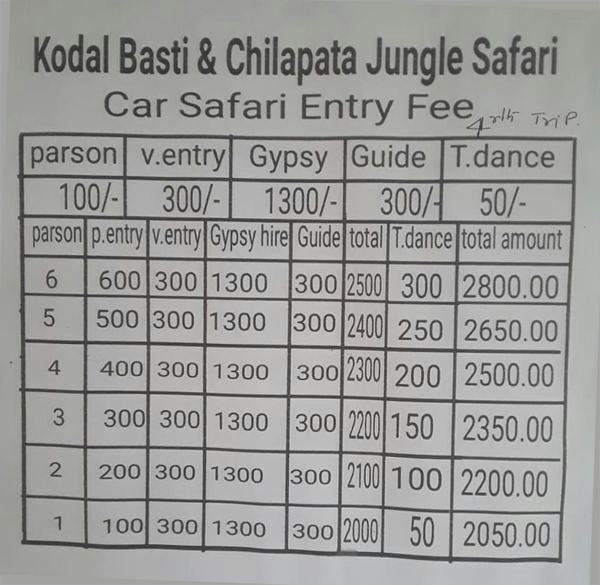 Chilapata forest safari price, Chilapata forest entry fee, etc are all given in the chart below :